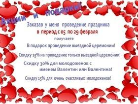 Заказав проведения праздника в период действия акции, Вы получаете в подарок проведение выездной церемонии! Скидку 25% на проведение только...