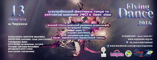 Дорогі танцюристи, 12-13 березня пройдуть Всеукраїнські змагання "Flying Dance" у м. Черкаси. Буде проводитися Кубок України з диско та слоу та рейтингові змагання з інших дисциплін.